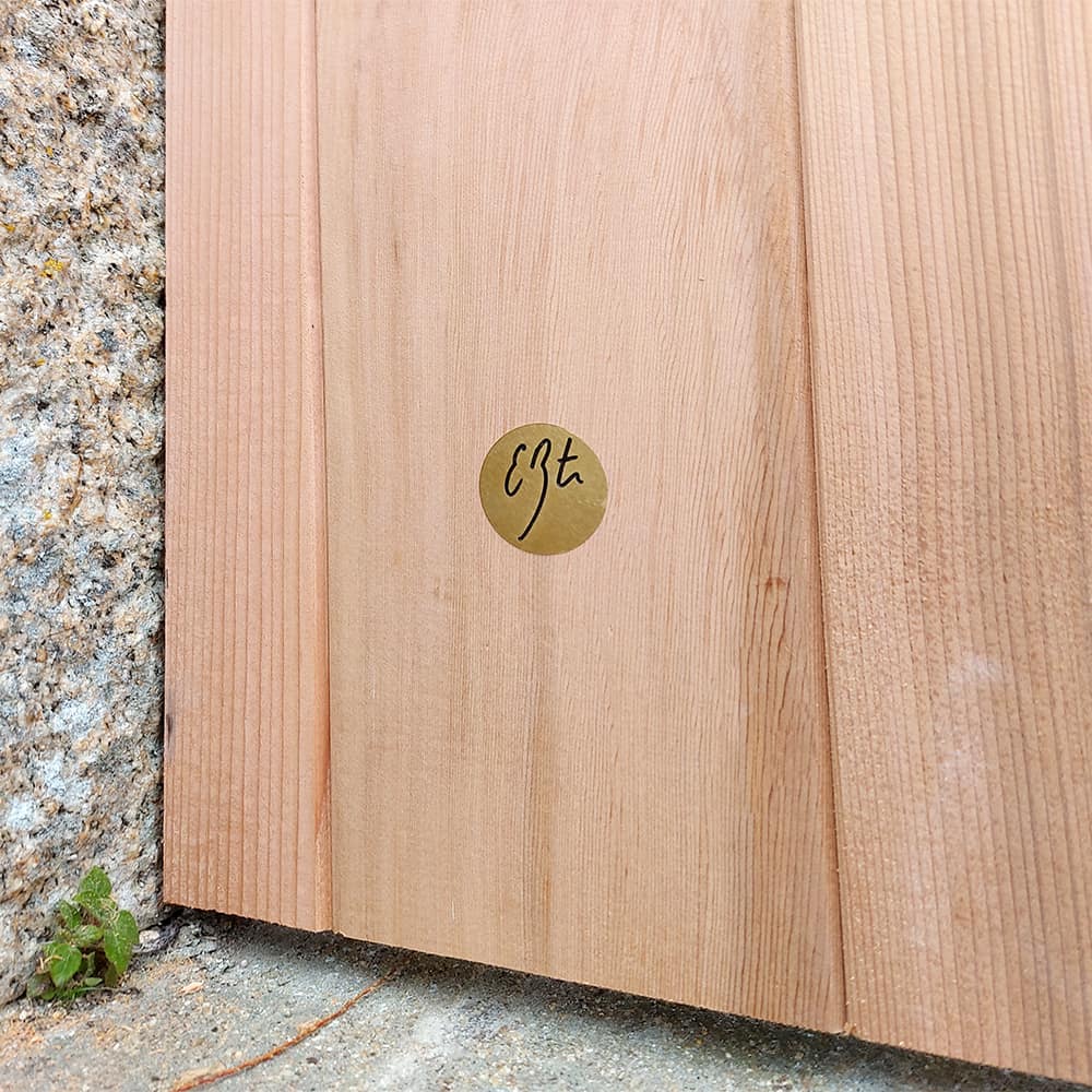 Le portail a été réalisé en Red Cedar, un bois reconnu pour sa résistance et son élégance. Avec le temps, il prend une patine gris argenté naturelle, parfaitement adaptée à l’environnement marin.