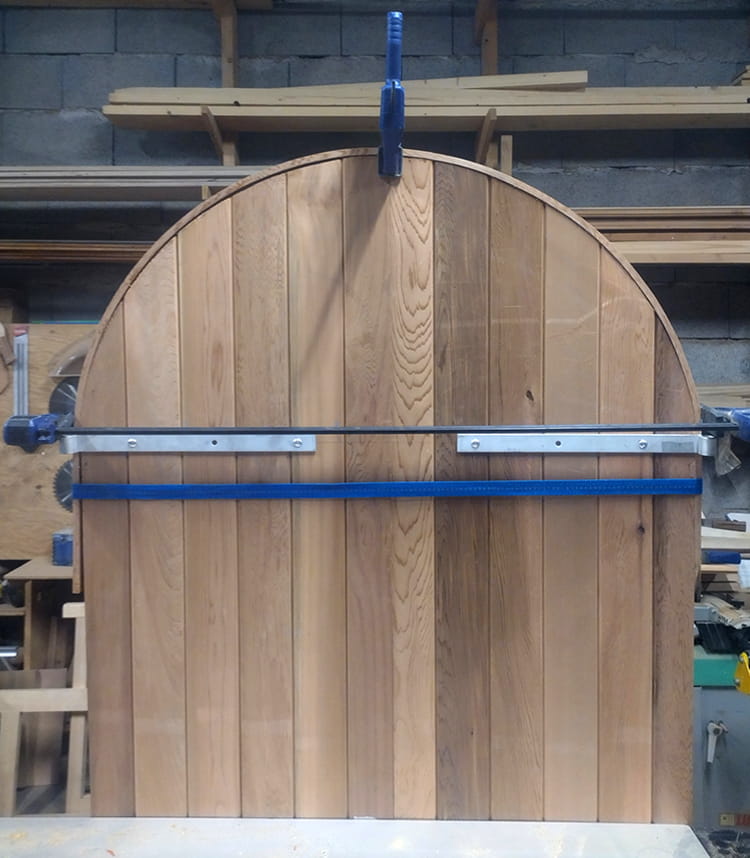 Les volets sont façonnés en ogive et soulignés d’une latte supérieure arrondie.