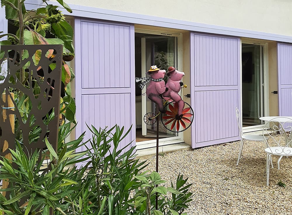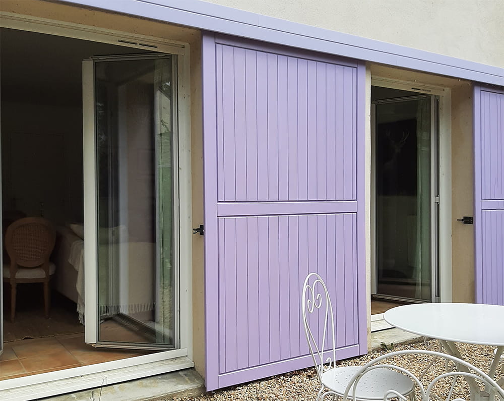 Ces volets coulissants fabriqués en sipo, ont été peints aux couleurs de la bourrache qui va bientôt fleurir. Nous respectons toujours le choix du client.